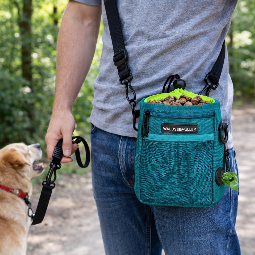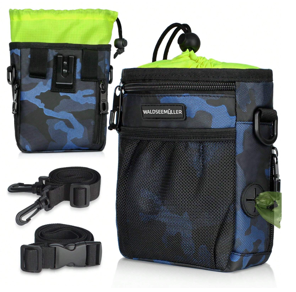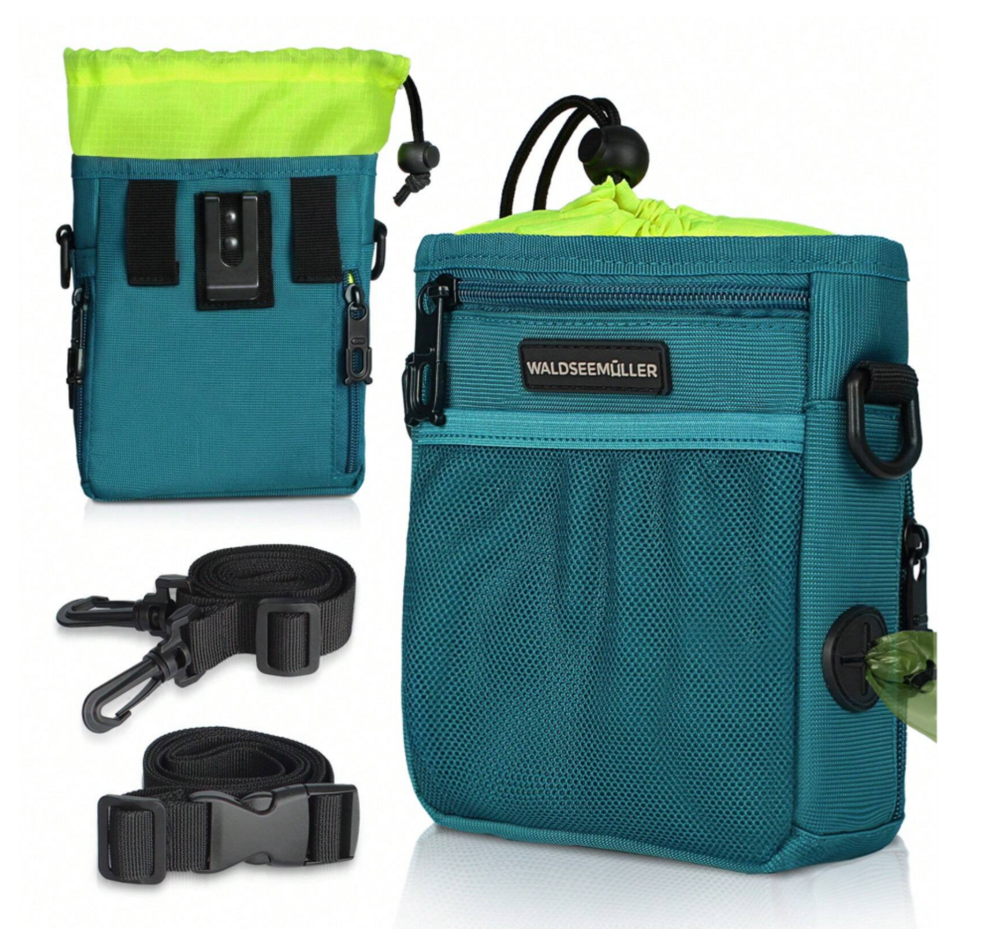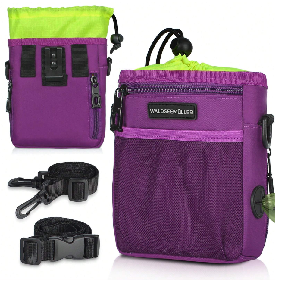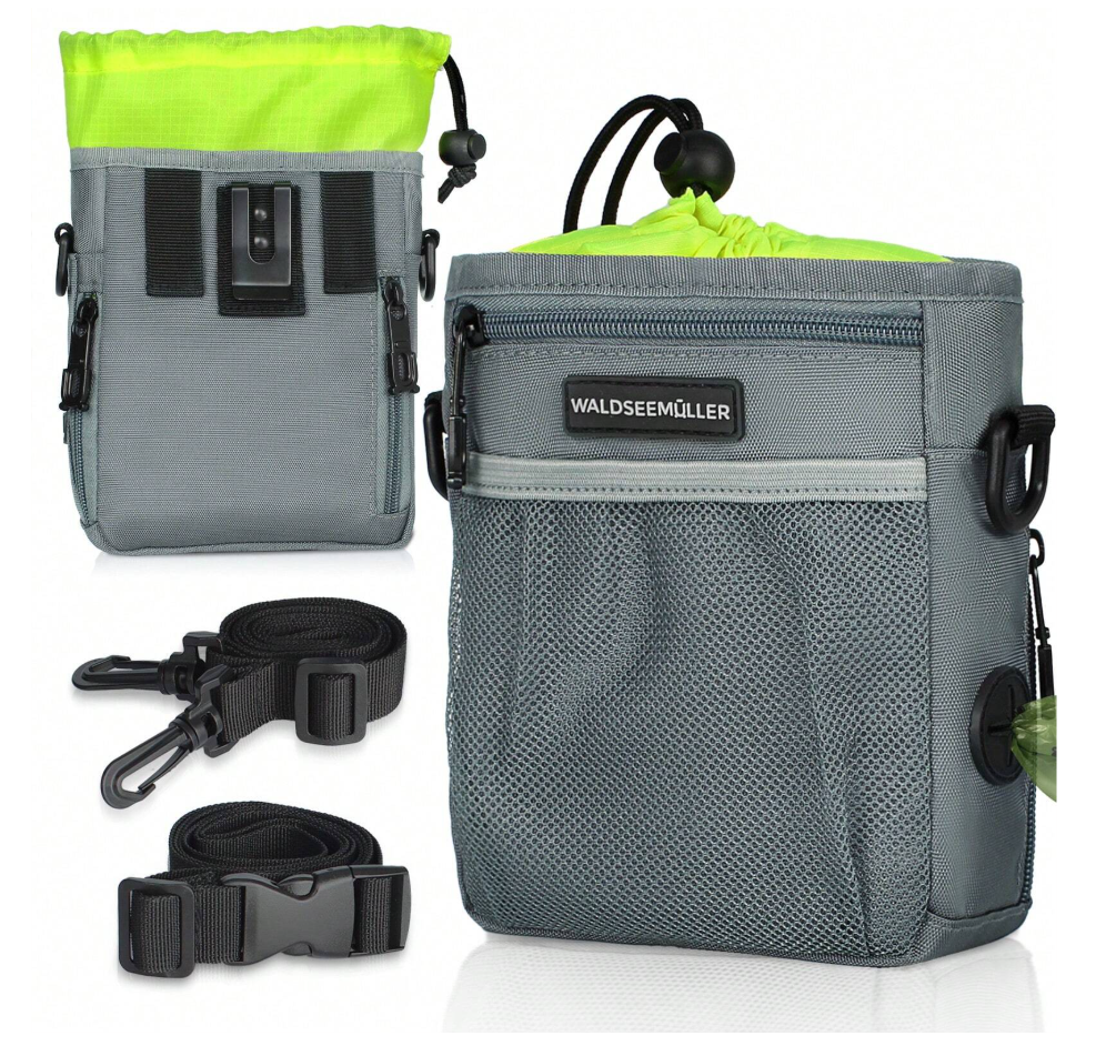 שקית נשיאה פרקטית לכלבים עם מספר אופציות ללבישה – חגורה מתכווננת, רצועת כתף ו-קליפס לקבע על חגורה/תיק.