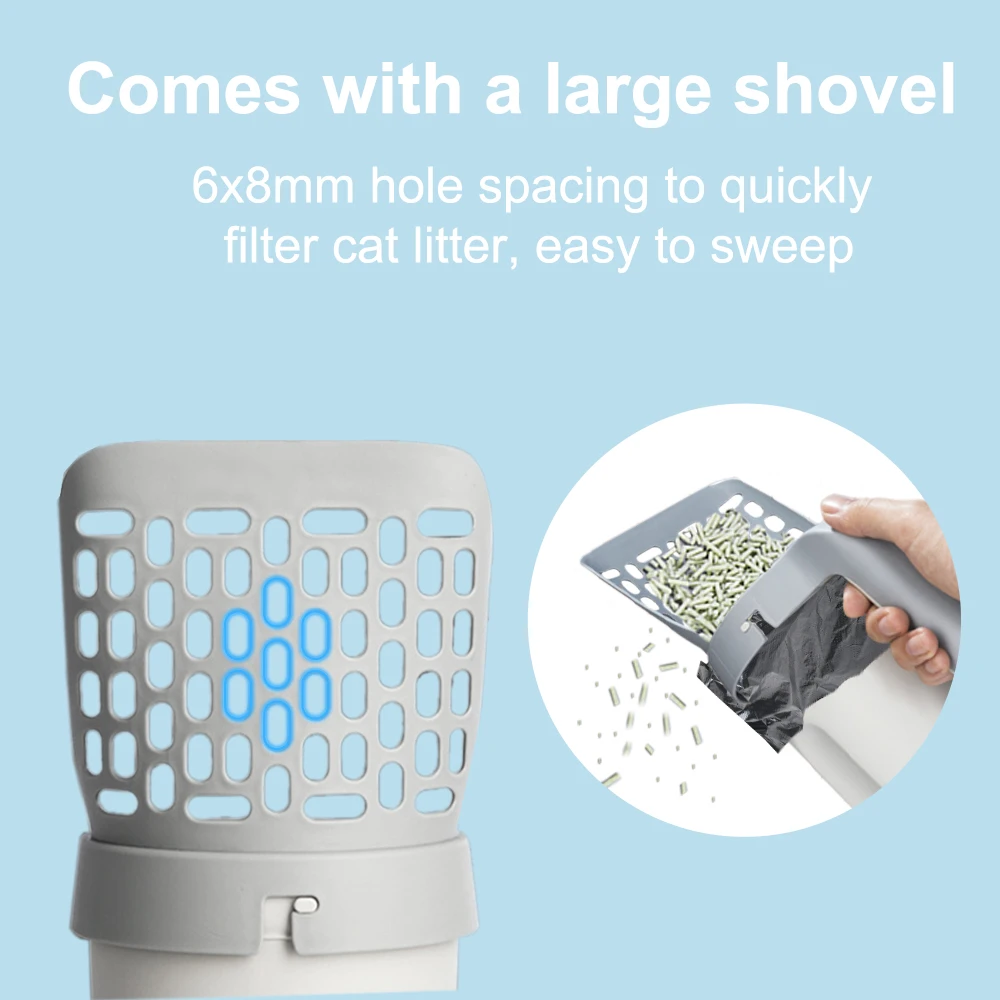 Designed for convenience and cleanliness, this innovative tool combines a sturdy scoop with an integrated waste bin and bag dispenser, making litter box maintenance quick and mess-free.